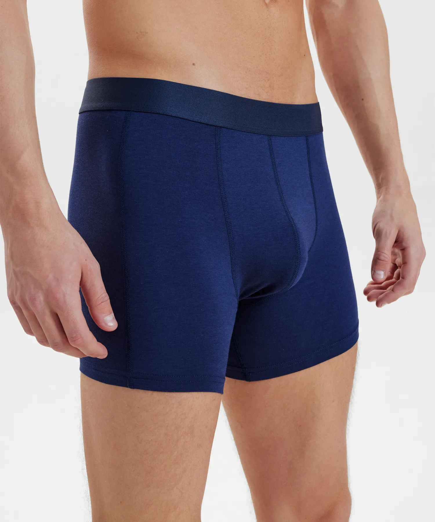Resteröds Kalsonger 3-Pack Bambu med långa ben i färgen marinblå. Producerade i en mix av FSC®-certifierad bambu, ekologisk bomull och flexibel elastan. Kalsongerna är av modellen boxers med förlängda ben. De långa benen maximerar passform, ger dig goda förutsättningar för aktivitet och förebygger att kalsongerna rullar upp. Kalsongerna är snyggt designade i skimrande blå färg med Resteröds logotyp tryckt ton-i-ton på resåret.